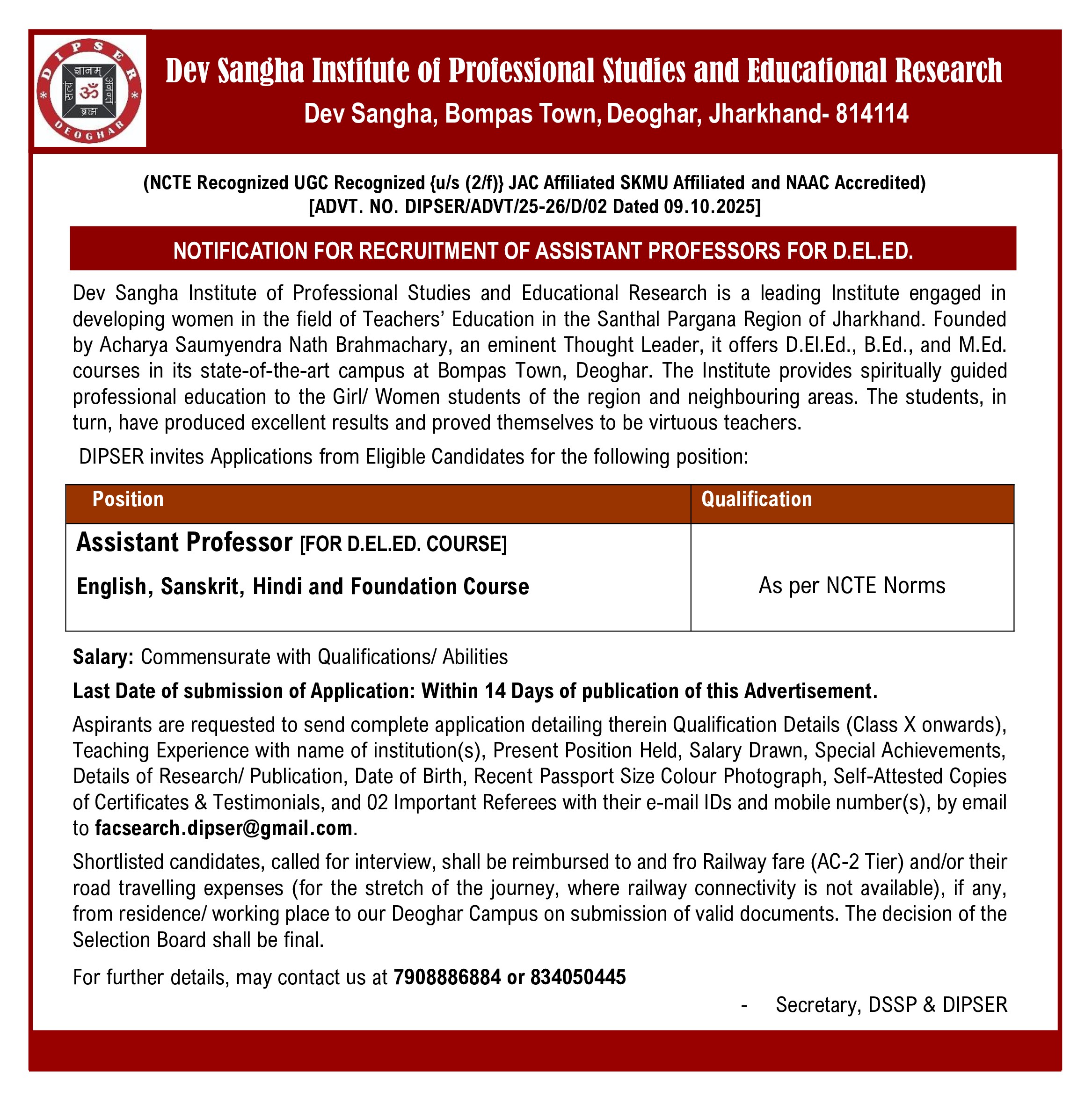Notification for Recruitment of Assistant Professors for D.El.Ed. Posted on October 8, 2025December 2, 2025 by admin